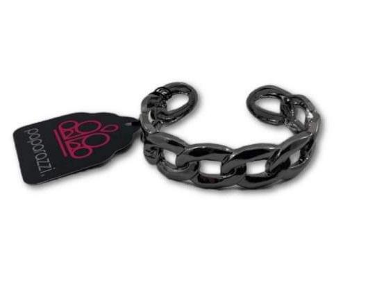 Brushed in a high sheen finish, oversized gunmetal chain links boldly connect into a gritty cuff around the wrist.