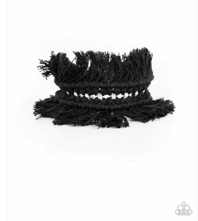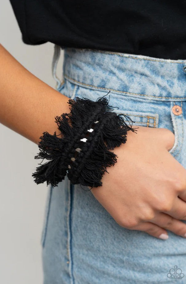 Black thread decoratively knots around an airy silver cuff, creating a macramé inspired fringe around the wrist.