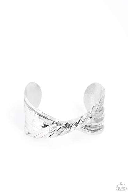 Featuring sections of glistening hammered surfaces, high-sheen silver ribbons curl across the center of the wrist in a crisscross motion, coalescing into an intense industrial cuff.