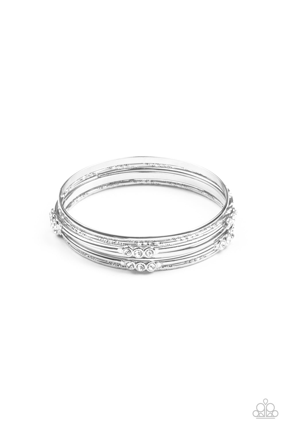 Pairs of plain, textured, and white rhinestone adorned silver bangles glide along the wrist for a sparkly look.