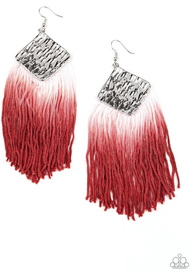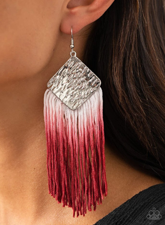 Fading from white to Samba, shiny thread dances from the bottom of a hammered silver frame, creating a flirtatious fringe. Earring attaches to a standard fishhook fitting.