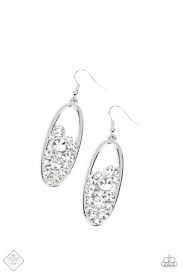 Effervescent stacks of brilliant white rhinestones bubble up inside a simple silver oval frame creating a prismatically stunning lure. Earring attaches to a standard fishhook fitting.