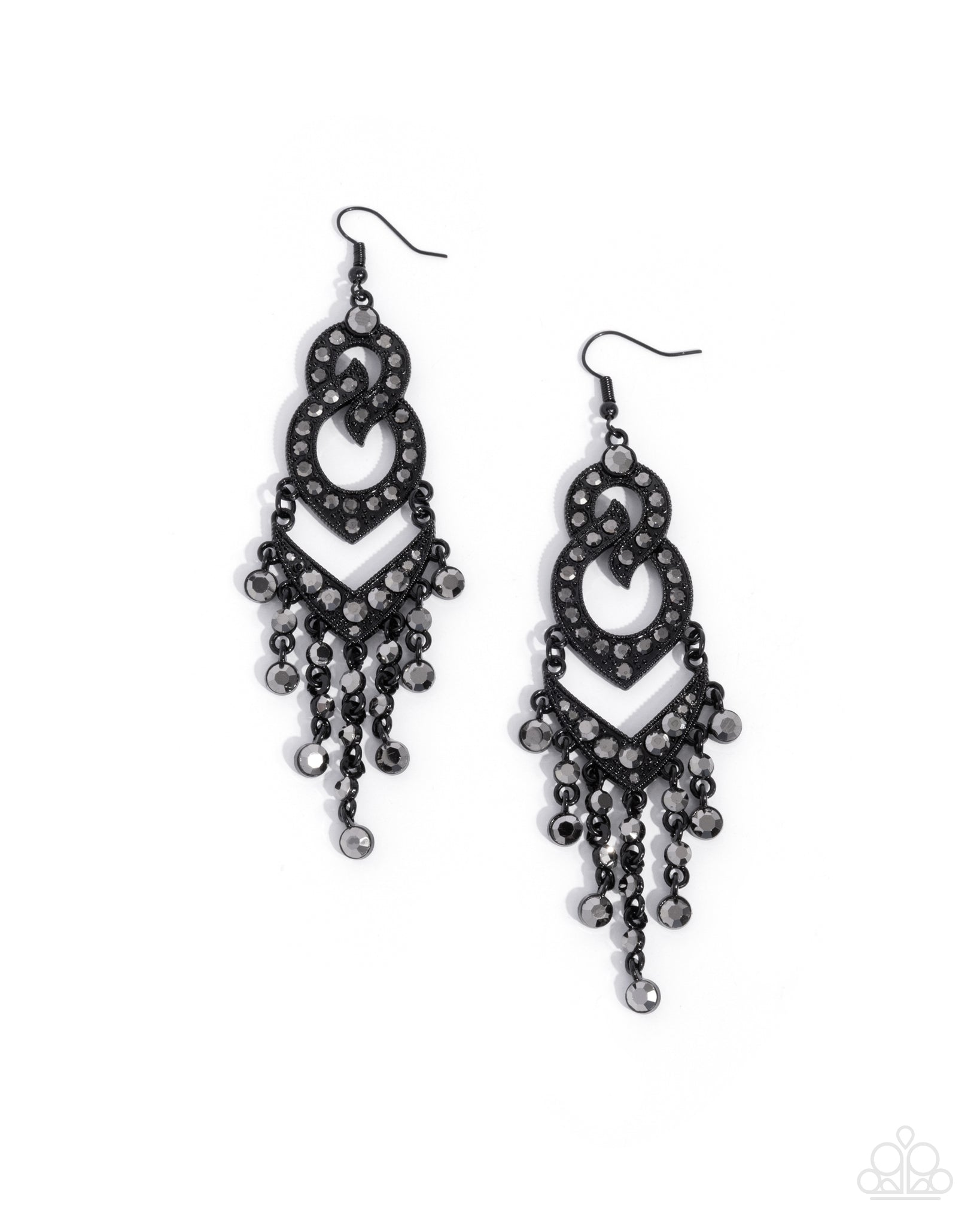 An array of hematite gems decoratively adorns the front of studded and filigree black-painted frames, while tapered strands of hematite gems drip from the bottom of the v-shaped frame, creating a whimsical fringe. Earring attaches to a standard fishhook fitting.