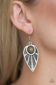 A polished bead is pressed into the top of an ornate silver teardrop radiating with studded textures for a tribal inspired look. Earring attaches to a standard fishhook fitting.