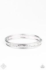 A silver bangle adorned in shimmery white pearls and glistening white rhinestones is paired with two classic silver bangles for a layered look.