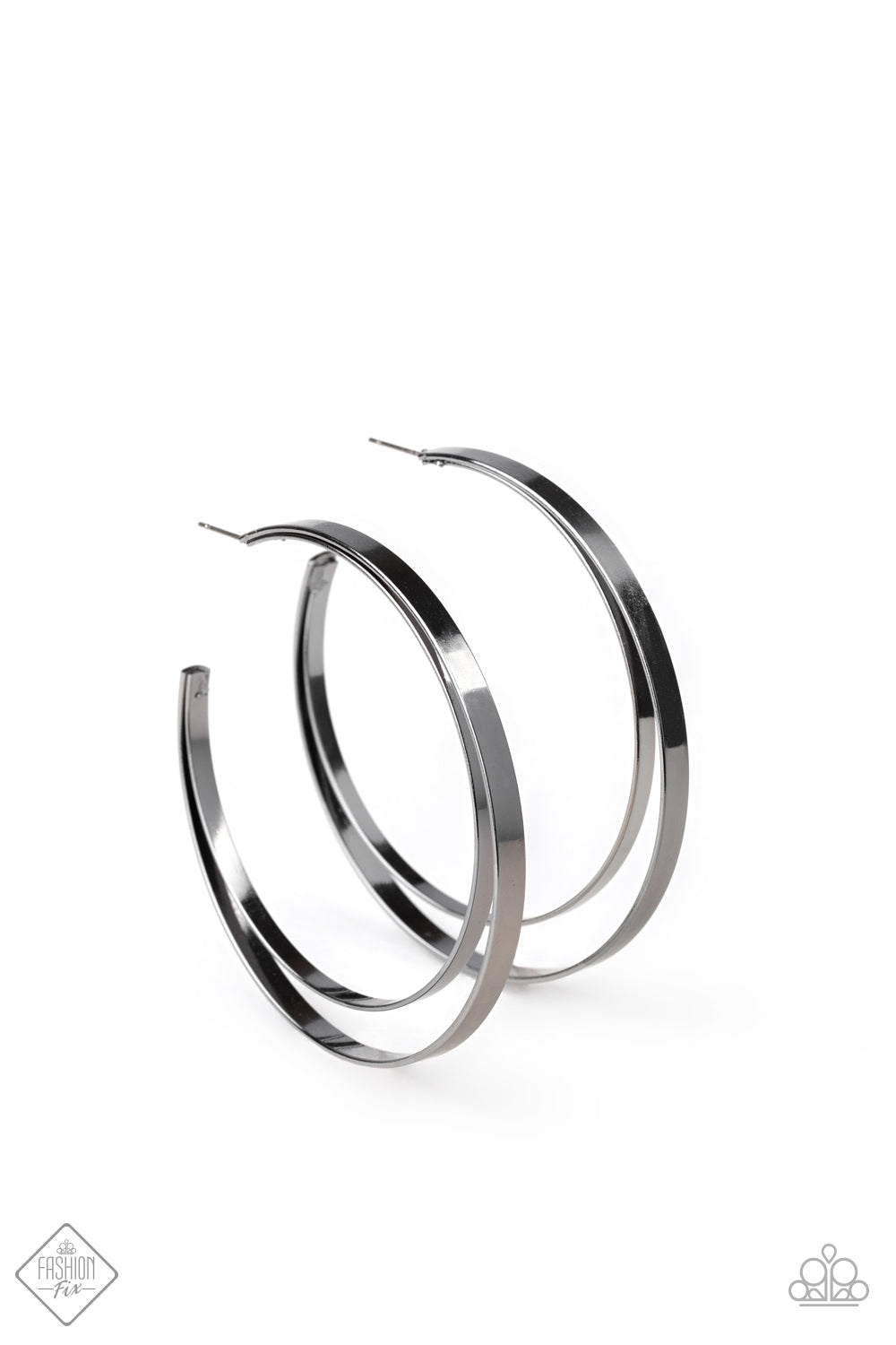 Two flat gunmetal or silver bars curl into a dizzying hoop for a dramatically edgy look. Earring attaches to a standard post fitting. Hoop measures 2 3/4" in diameter.