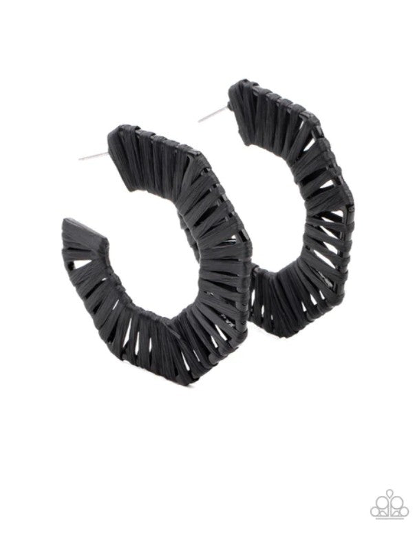 Black wicker-like cording is wrapped around a hexagonal hoop, creating a bold pop of color. Earring attaches to a standard post fitting. Hoop measures approximately 2" in diameter.