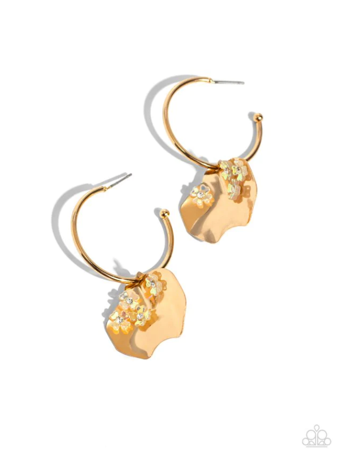A small, skinny, gold hoop curves around the ear, where a gold ball is affixed to create the look of a barbell. A warped gold disc, embellished with iridescent flowers, slides along the hoop, showcasing a mermaid tail-inspired statement. Earring attaches to a standard post fitting. Hoop measures approximately 1 1/4" in diameter. Due to its prismatic palette, color may vary.