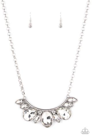 An oversized collection of round, marquise, and teardrop white rhinestones drip from the bottom of a bowing silver bar, coalescing into a sassy statement piece below the collar. Features an adjustable clasp closure.
