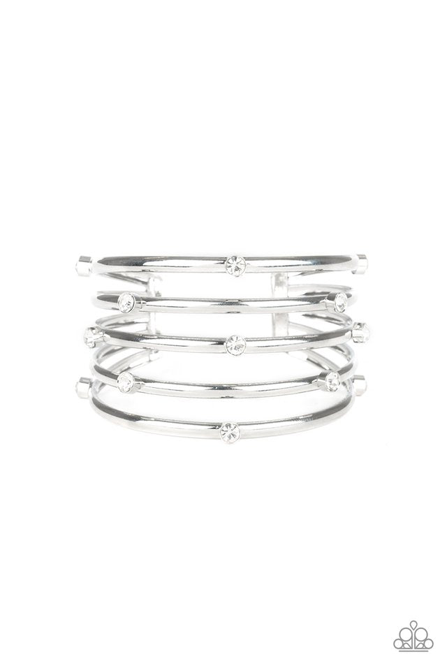 Sporadically dotted in glassy white rhinestones, thick silver bars stack across the wrist, coalescing into a statement-making cuff.