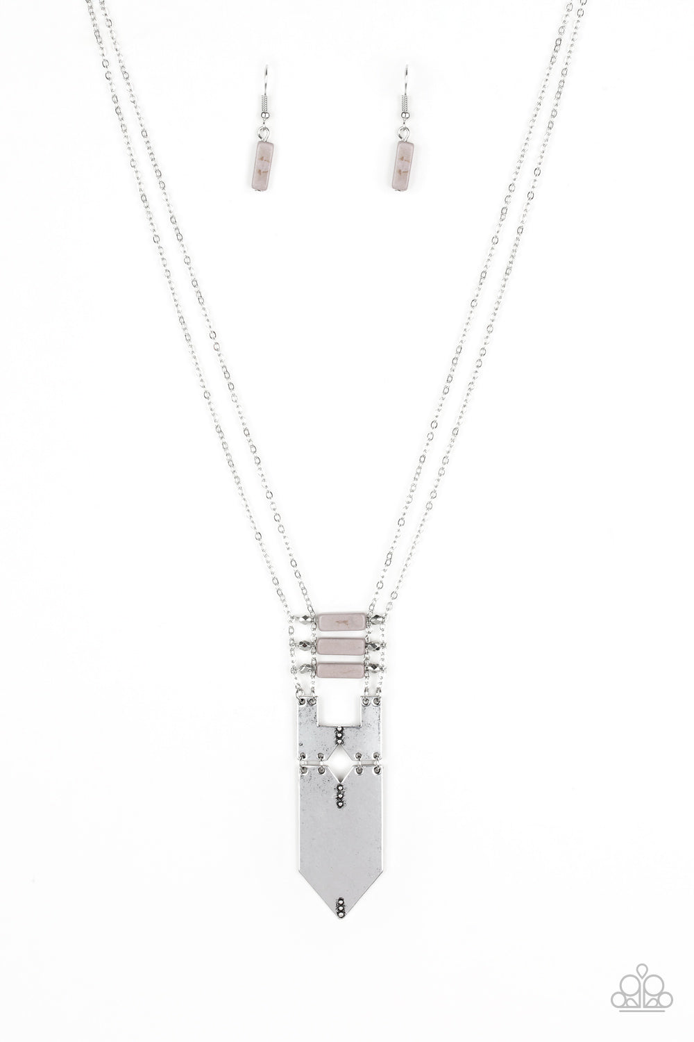 Dotted in sections of dainty silver studs, shiny silver plates connect at the bottoms of doubled silver chains. Infused with faceted silver accents, a row of rectangular gray stones give way to the tribal inspired plates for an authentic artisan finish. Features an adjustable clasp closure.