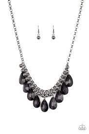 A row of glistening gunmetal beads gives way to glassy black teardrops, creating a bold tone on tone fringe below the collar. Features an adjustable clasp closure.