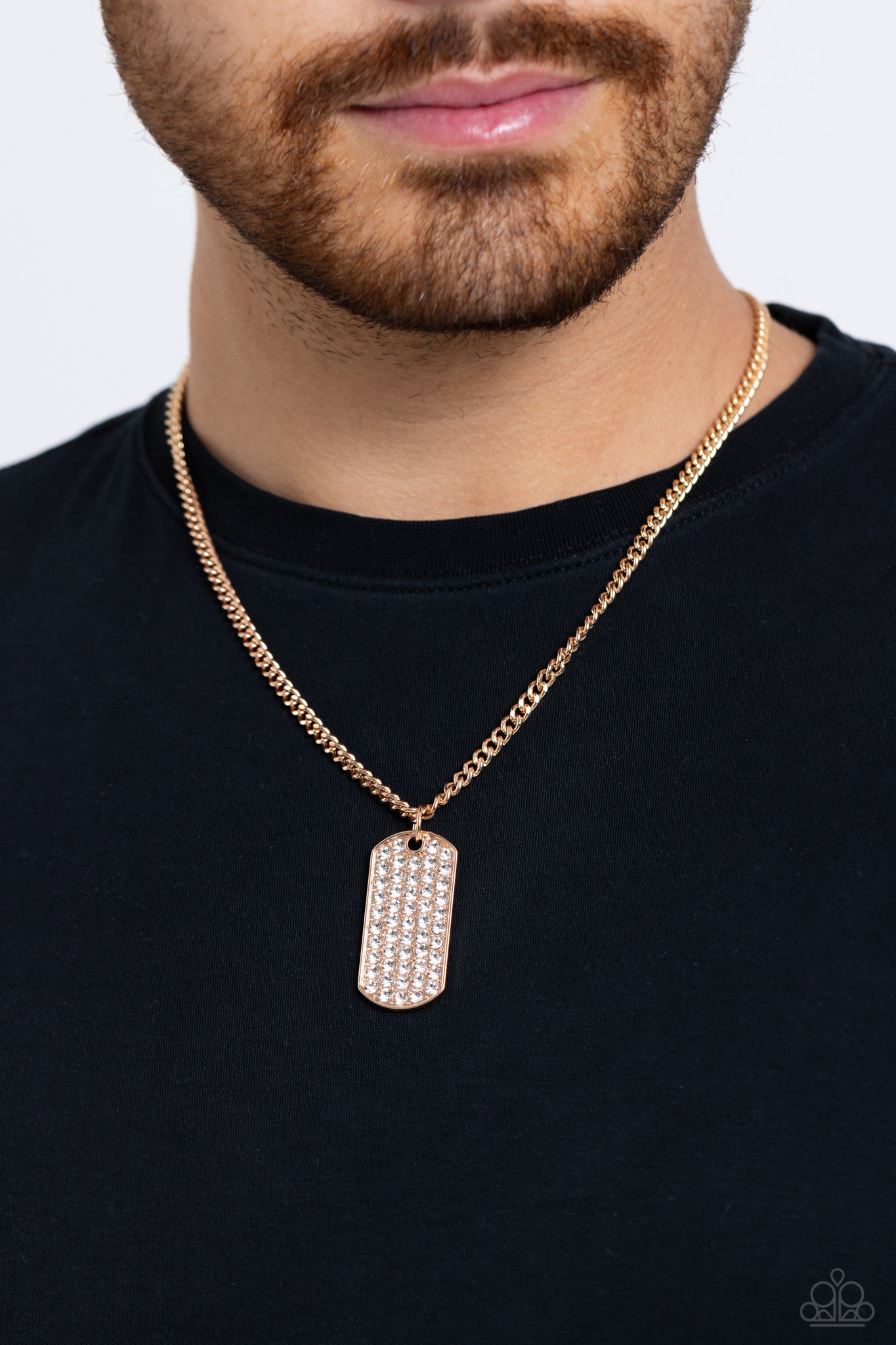 Infused with rows and rows of glittery white gems, a gold dog tag pendant glides along an elongated classic gold chain for an industrially glitzy finish. Features an adjustable clasp closure.
