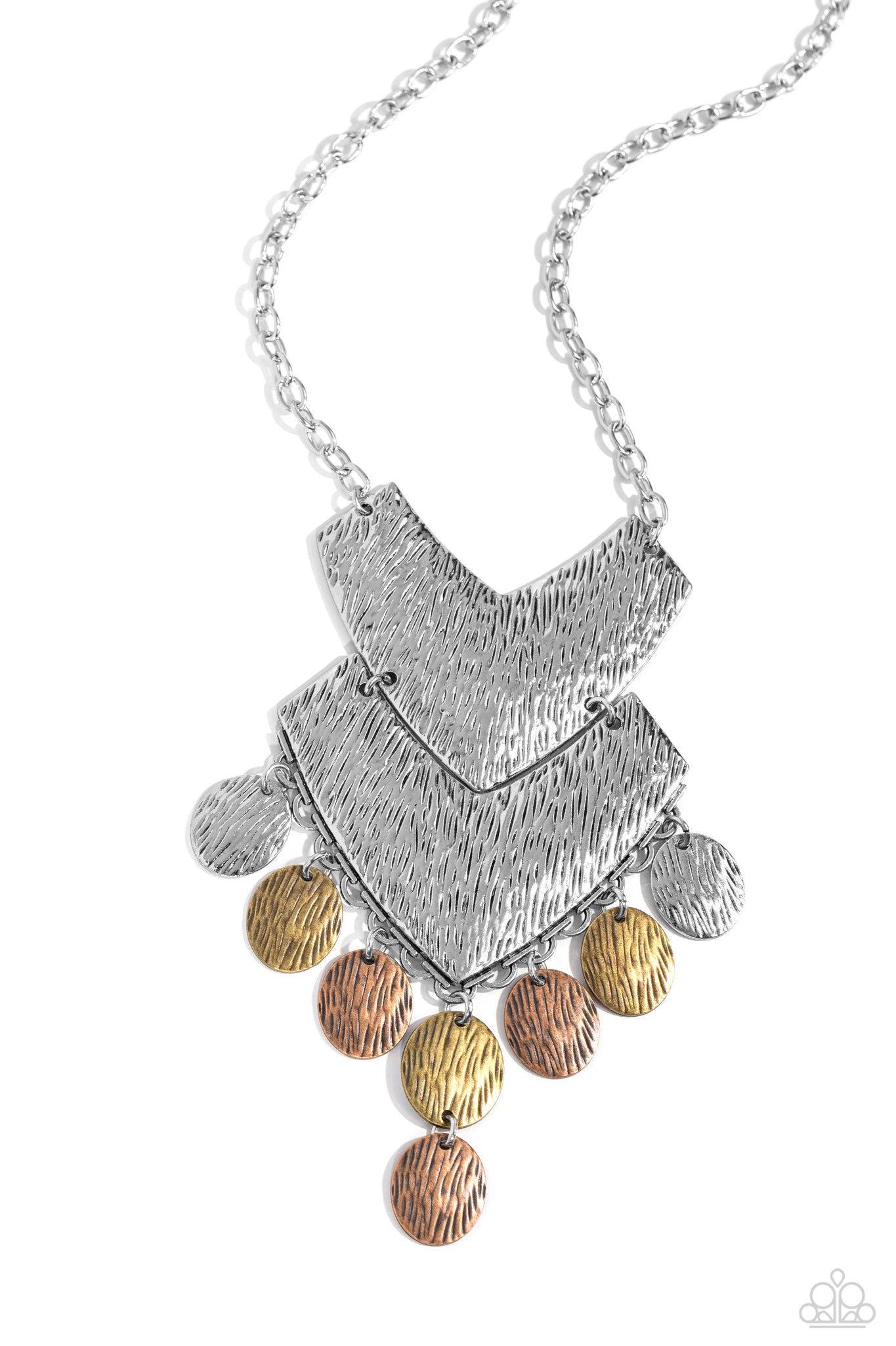 Etched in rustic silver textures, a pair of oversized chevron-like silver frames delicately link into a wild statement piece. Matching textured silver, brass, and copper discs swing from the bottom of the stacked display, adding a noisemaking movement to the rambunctious pendant. Features an adjustable clasp closure.
