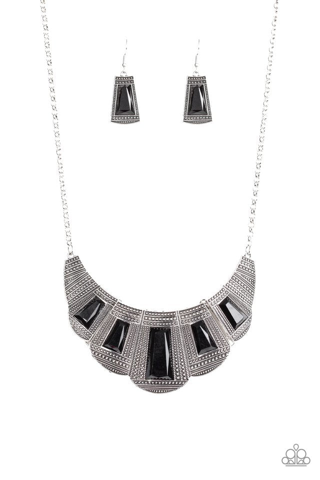 Featuring faceted emerald style cuts, bold geometric black or purple beads are pressed into studded silver frames that dramatically link below the collar for a fierce finish. Features an adjustable clasp closure.