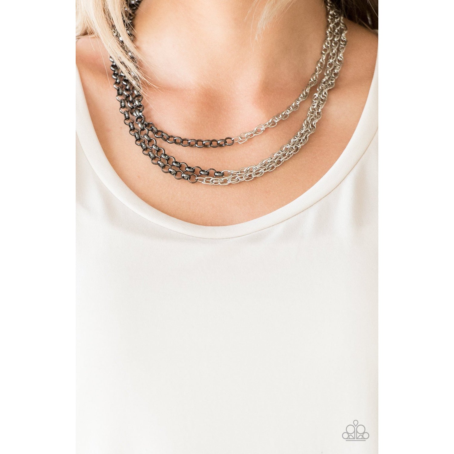 Strung between two gunmetal fittings, glistening gunmetal chains collide with shimmery silver chains below the collar, creating edgy mixed metallic layers. Features an adjustable clasp closure.