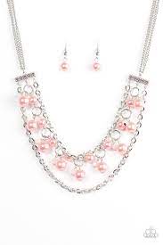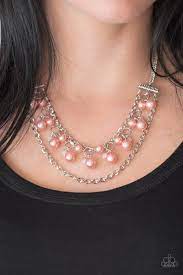 Attached to two floral fittings, rows of shimmery silver chains flank a pearly beaded strand below the collar. Dramatic green pearls and faceted crystal-like beads swing from the centermost strand for a refined finish. Features an adjustable clasp closure.