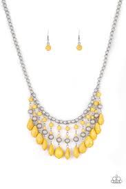 Shiny silver beads are threaded along an invisible wire below the collar. Infused with silver beaded accents, refreshing beads swing from the bottom of the beaded strand, creating an earthy fringe. Features an adjustable clasp closure.