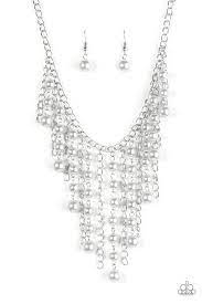 Pearly silver beads trickle along strands of glistening silver chains, creating a tapered fringe below the collar. Features an adjustable clasp closure.