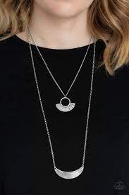 Radiating with linear patterns, a flared silver frame swings above a silver half-moon frame, creating tribal inspired layers below the collar. Features an adjustable clasp closure.