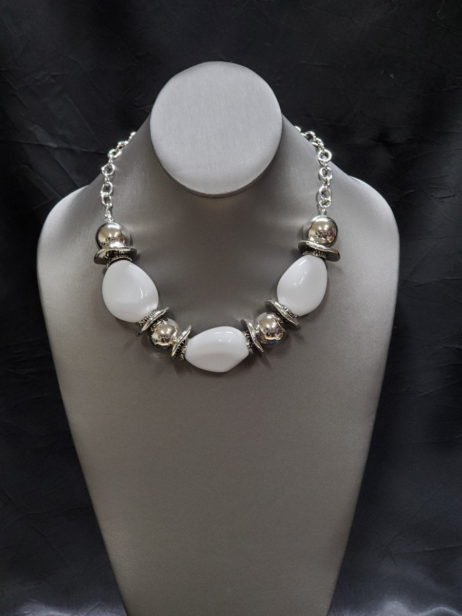 A collection of oversized beads, shiny silver beads, and beveled silver discs are threaded along an invisible wire below the collar for a vivacious look. Features an adjustable clasp closure.