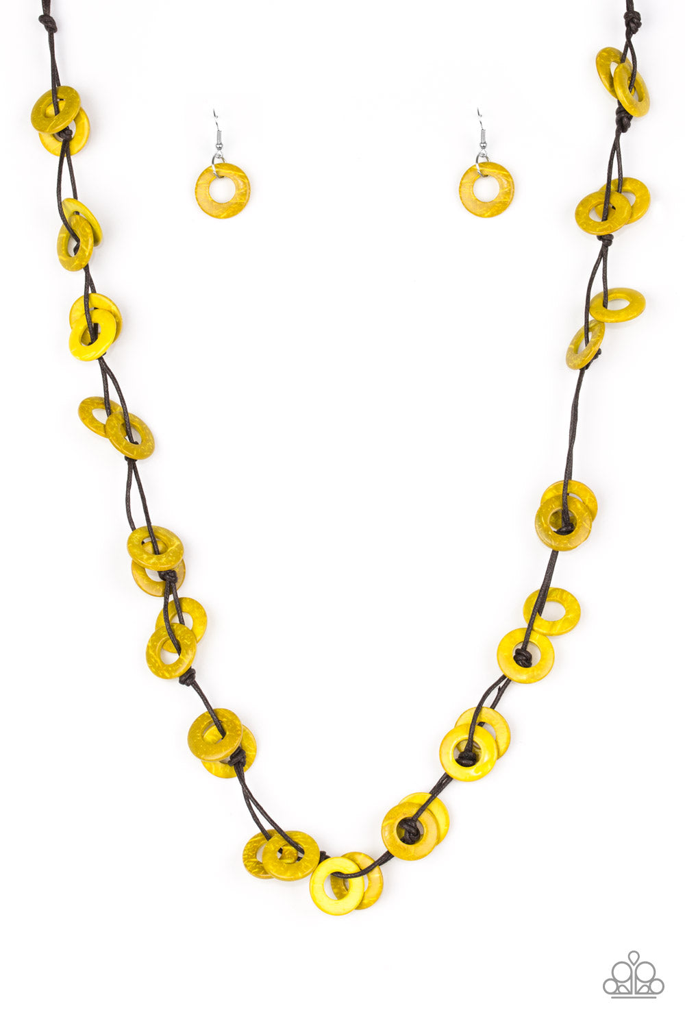 Shiny brown cording knots around sunny yellow wooden discs, creating a colorful display across the chest. Features a button loop closure.