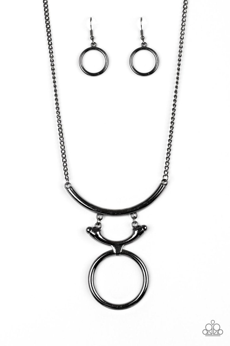 Two glistening gunmetal crescents attach to a large gunmetal hoop, creating a tribal inspired pendant below the collar. Features an adjustable clasp closure.