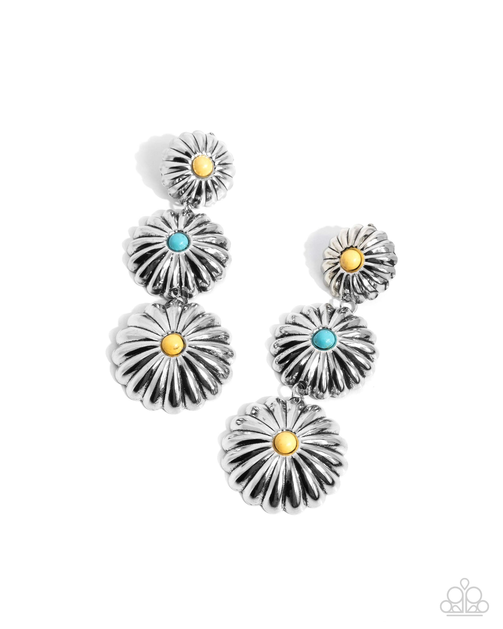 Refreshing turquoise and yellow stone accents are pressed into circular silver frames embossed in radiating floral-inspired textures, attaching to a silver cable chain below the neckline for a seasonal finish. Features an adjustable clasp closure. As the stone elements in this piece are natural, some color variation is normal. Sold as one individual necklace. Includes one pair of matching earrings. Refreshing turquoise and yellow stone accents are pressed into circular silver frames embossed in radiating floral-inspired textures, cascading below the ear for a seasonal finish. Earring attaches to a standard post fitting. As the stone elements in this piece are natural, some color variation is normal. Sold as one pair of post earrings.