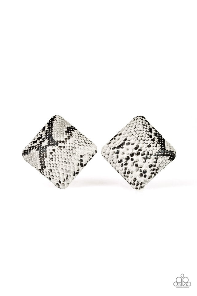 Featuring a python print, an overly dramatic square frame dots the ear for a statement-making look. Earring attaches to a standard post fitting.