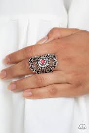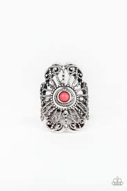 A pink dainty bead in the fall Pantone of Fruit Dove is pressed into a round silver frame swirling with studded details for a whimsical vibe. Features a stretchy band for a flexible fit.