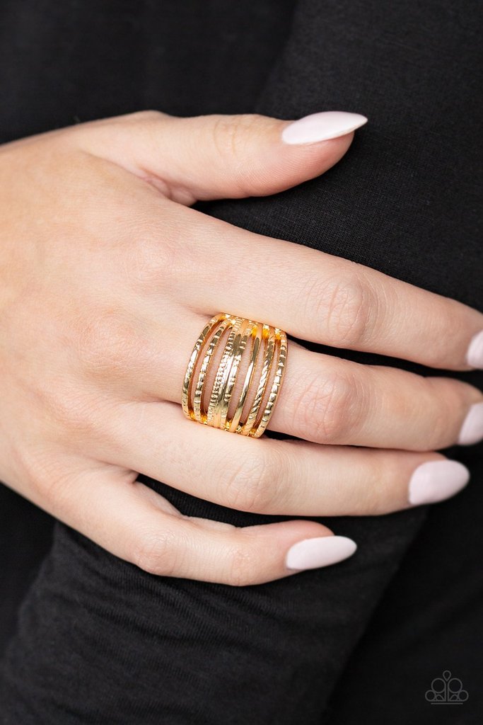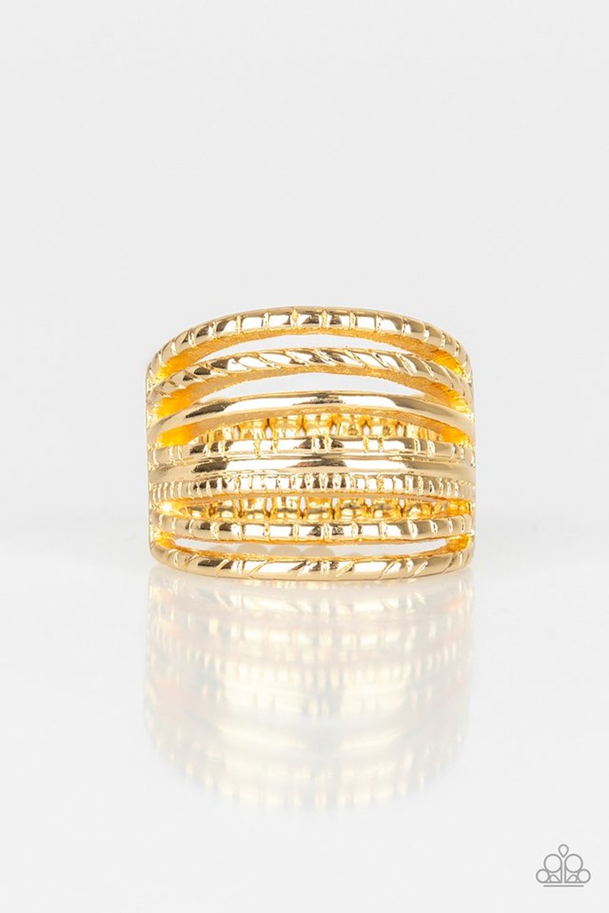 A collection of smooth and textured gold bars arc across the finger, stacking into a thick layered band. Features a stretchy band for a flexible fit.