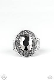 An over sized hematite gem is pressed into a round silver frame encrusted in stacked rings of smoky rhinestones in a regal finish. Features a stretchy band for a flexible fit.
