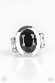 A faceted black gem is pressed into the center of a thick silver frame, making a deceptively simple impact. Features a stretchy band for a flexible fit.