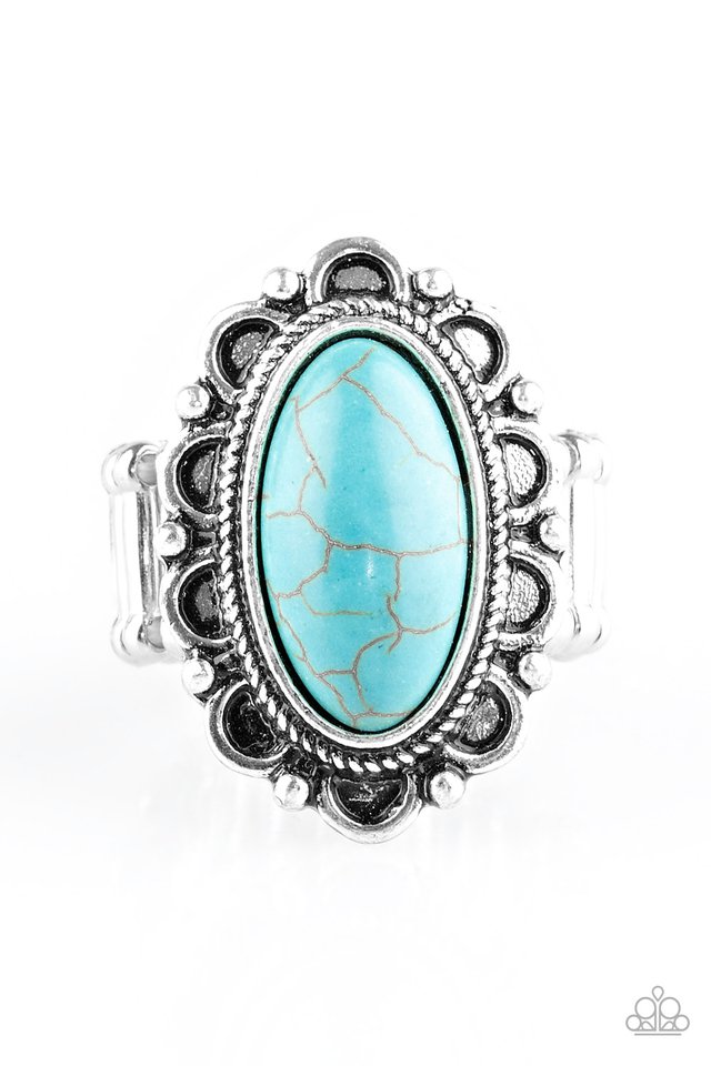 A smooth turquoise stone is pressed into the center of a silver floral frame radiating with antiqued textures. Features a stretchy band for a flexible fit.