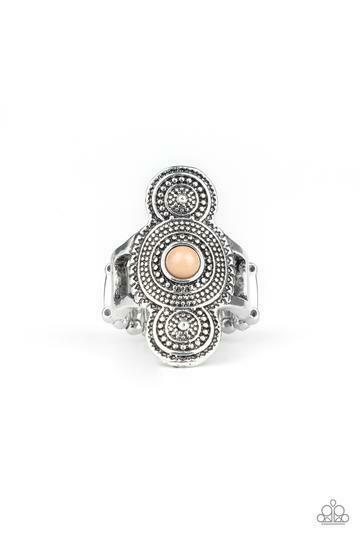 Studded with swirling silver detail, three round frames coalesce into a stacked frame. Infused with dainty silver beads, a neutral brown bead is pressing into the center of the mandala-like frame for a colorful finish. Features a stretchy band for a flexible fit.