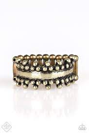 Trios of shimmery brass studs dot the top and bottom of an antiqued brass band for an edgy industrial look. Features a dainty stretchy band for a flexible fit.