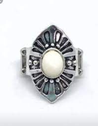 An earthy white stone bead is pressed into the center of an angular silver frame radiating with studded and antiqued textures. Features a stretchy band for a flexible fit.
