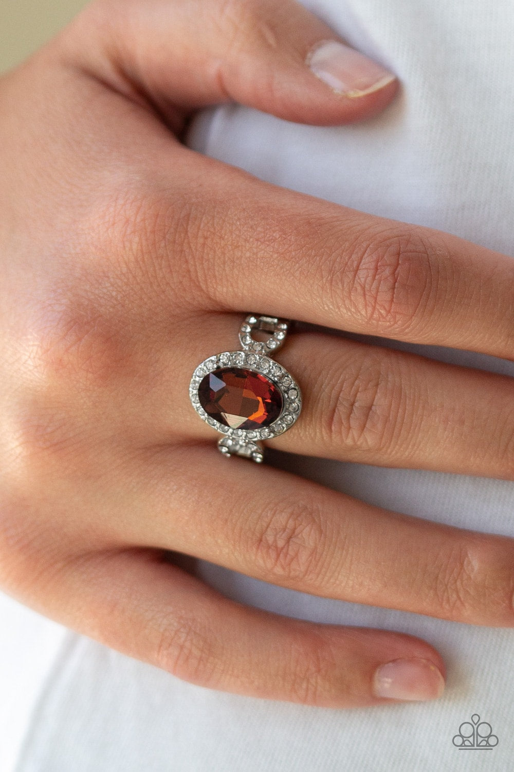 Magnificent Majesty Brown. An oval topaz gem is pressed into the center of a dainty silver frame radiating with glassy white rhinestones for a regal flair. Features a dainty stretchy band for a flexible fit.