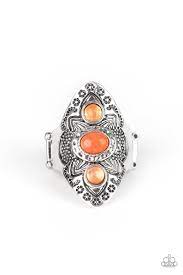 Stamped and studded in tribal inspired patterns, a thick silver frame folds around the finger. Glassy tiger's eye stones are pressed down the ornate frame for a colorful finish. Features a stretchy band for a flexible fit.