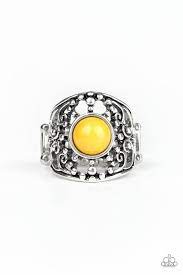 A hearty yellow bead is pressed into a shimmery silver frame swirling with studded filigree, creating a colorful centerpiece atop the finger. Features a stretchy band for a flexible fit.