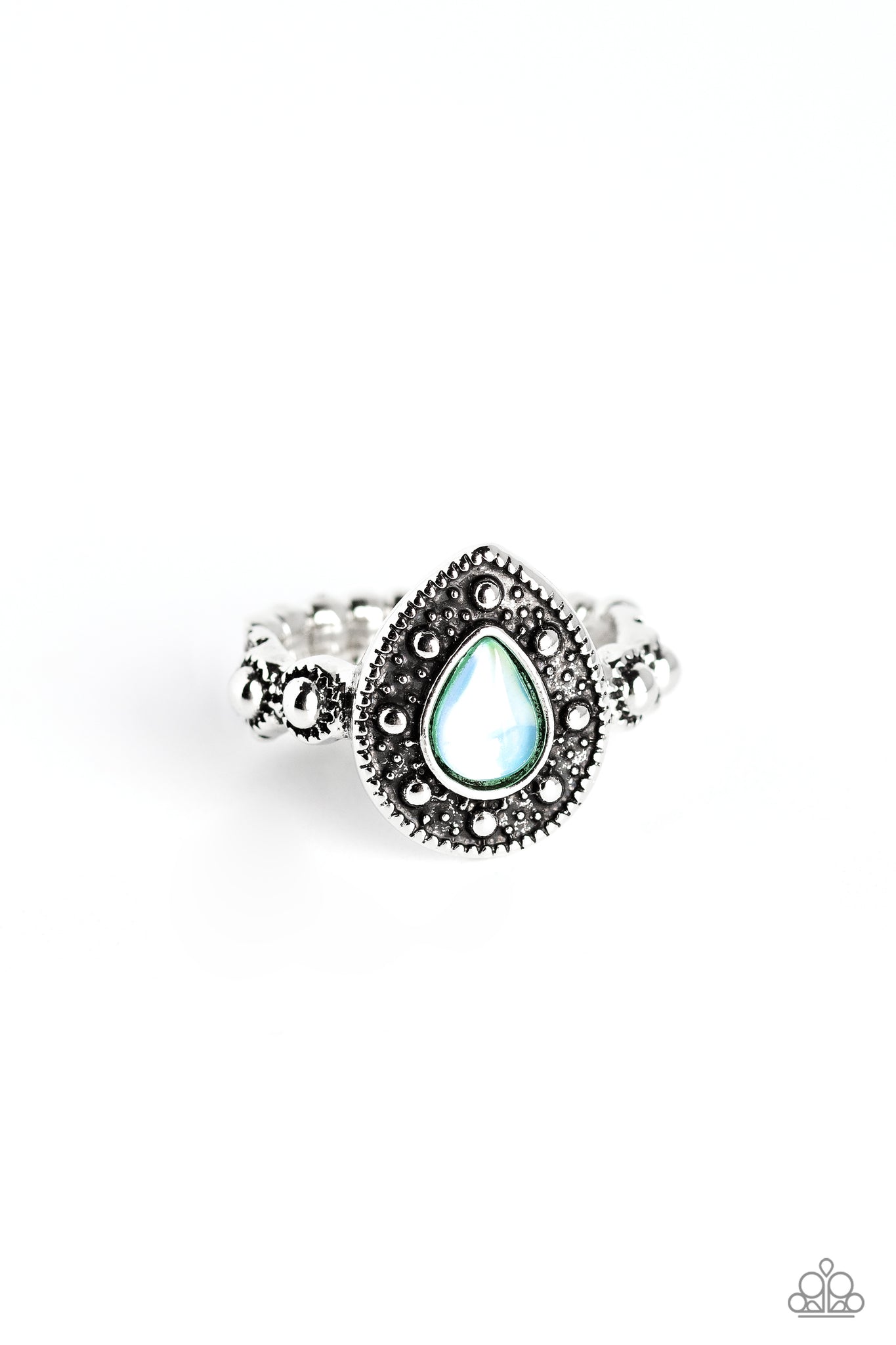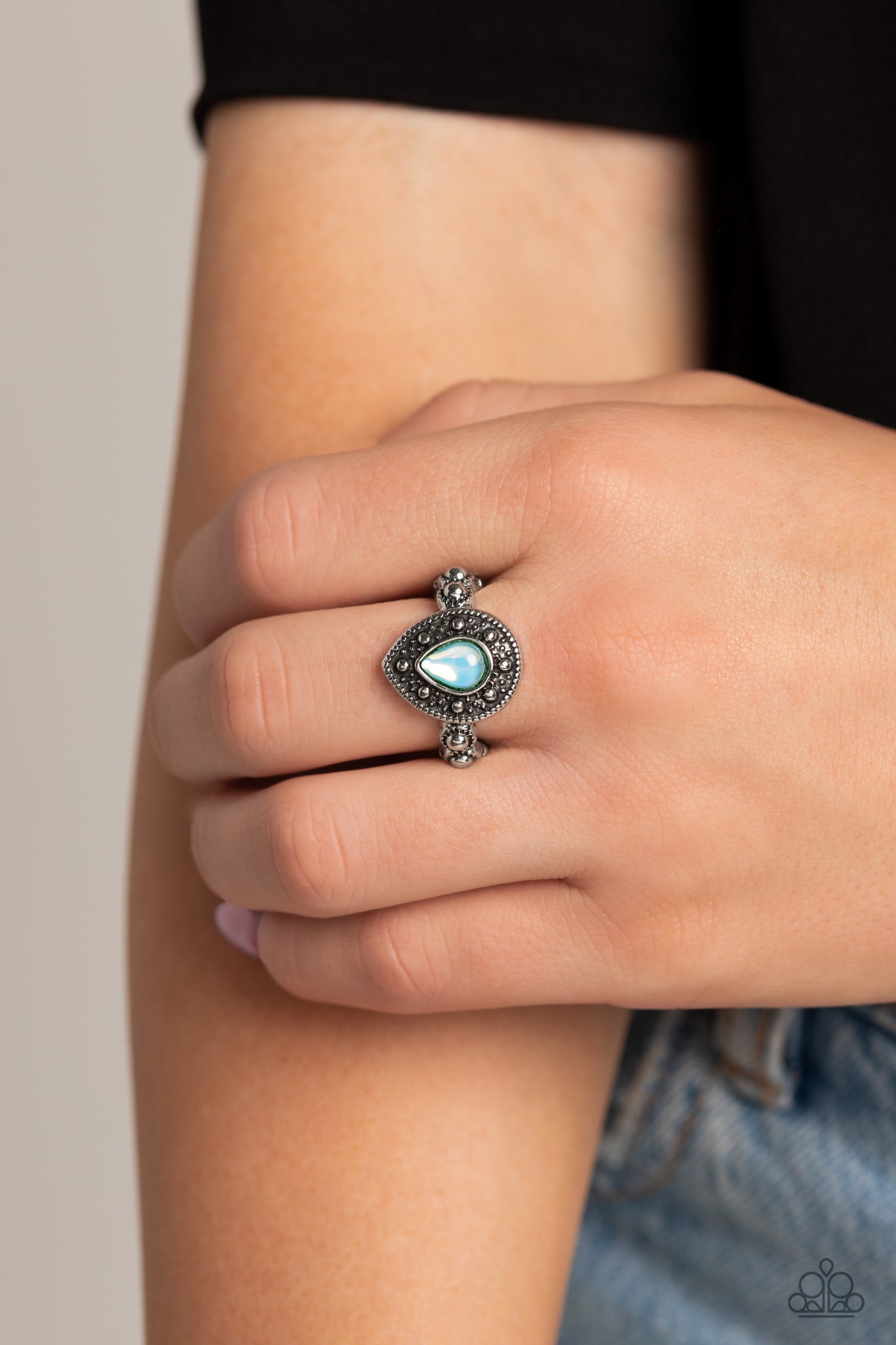 An opalescent blue teardrop is encased in an ornate frame of studded and rope-like textures, creating a grand display atop the finger. Dainty textured studs grace the silver band for additional eye-catching detail. Features a dainty stretchy band for a flexible fit.