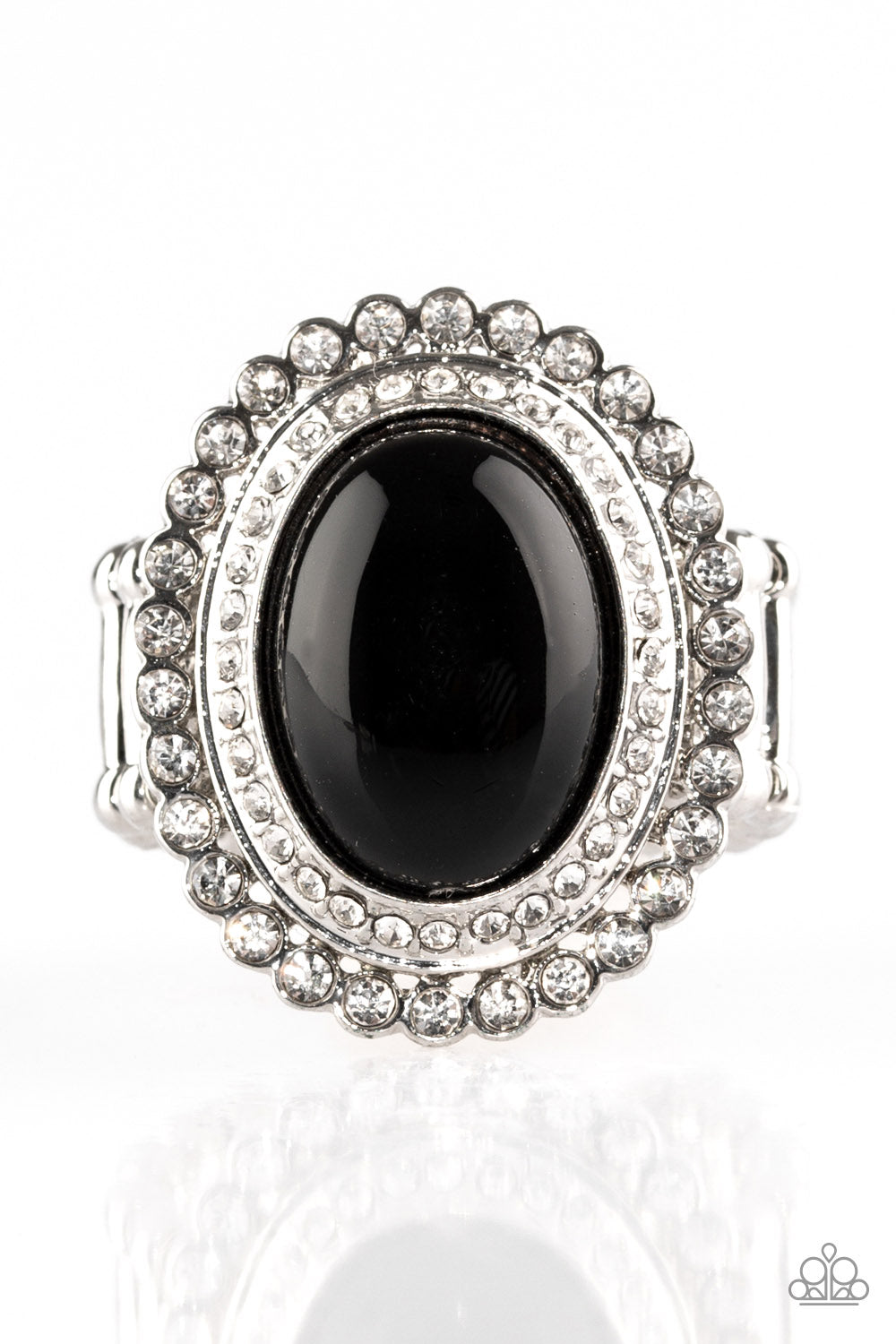 A shiny black bead adorns the center of stacked silver frames encrusted in glassy white rhinestones for a dramatically refined look. Features a stretchy band for a flexible fit.