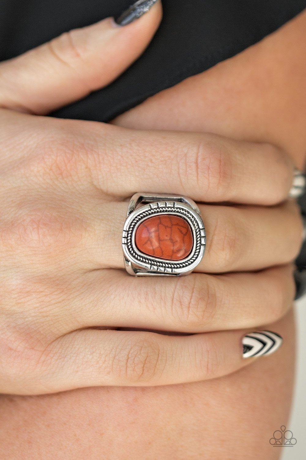 An earthy black stone is pressed into an asymmetrical silver frame radiating with tactile textures for a seasonal look. Features a stretchy band for a flexible fit.