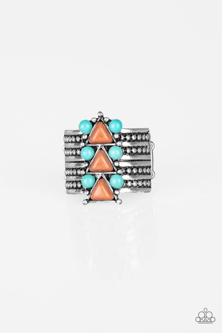 Round turquoise stones and brown triangular stones are pressed down the center of a thick silver band radiating with studded silver textures for an indigenous look. Features a stretchy band for a flexible fit.