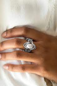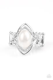 A pearly white bead is pressed into the center of an arcing silver frame for a refined look. Dainty white rhinestones are sprinkling along the inner silver frame, adding timeless shimmer to the classic piece.