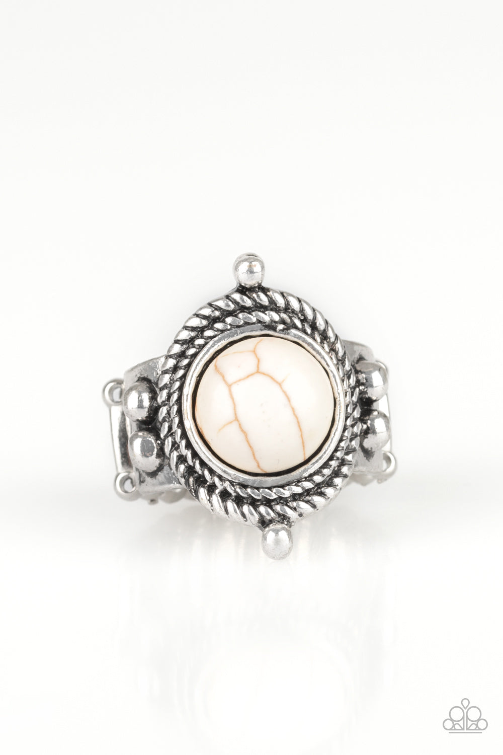 A refreshing stone is pressed into the center of a silver frame radiating with studded and twisted rope-like textures for an artisan inspired look. Features a stretchy band for a flexible fit.