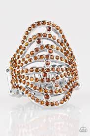 Countless dazzling rhinestones are sprinkled along swooping silver bands, creating a glamorous frame atop the finger. Features a stretchy band for a flexible fit.