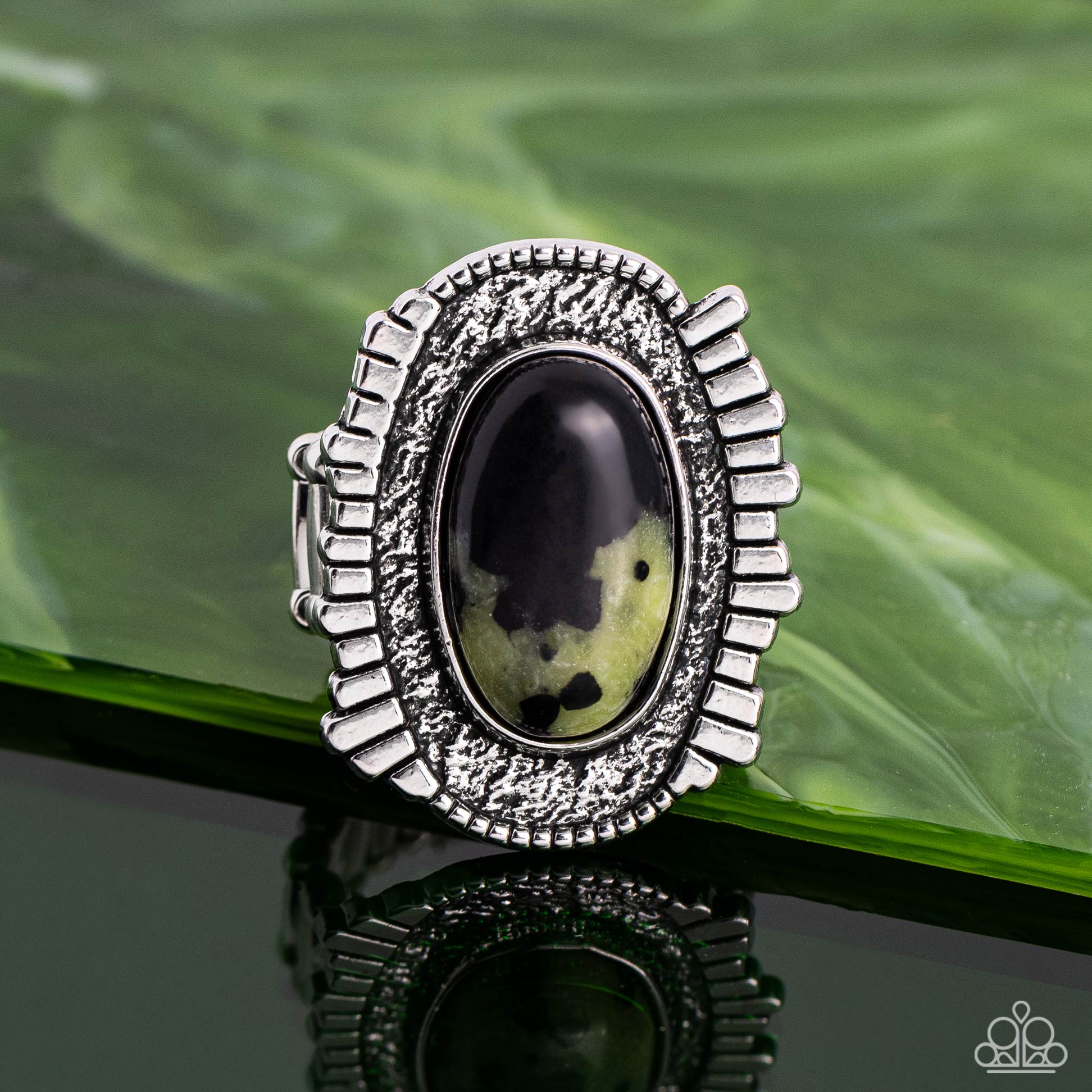 A speckled green stone adorns the hammered center of an oversized silver frame adorned in an asymmetrical silver fringe for a hint of artisan edge. Features a stretchy band for a flexible fit.
