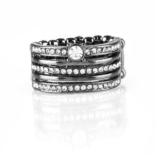 Encrusted in glassy white rhinestones, glittery bands alternate with shiny gunmetal bands across the finger. A slightly larger rhinestone adorns the uppermost band for a refined finish. Features a stretchy band for a flexible fit.