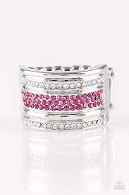Pink and white rhinestone encrusted bands stack across the finger for a glamorous look. Features a stretchy band for a flexible fit.